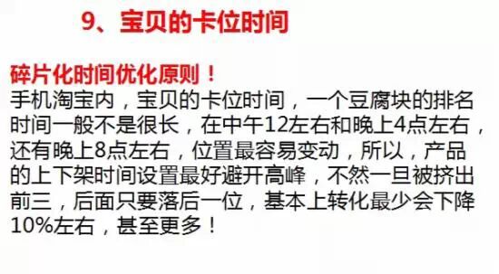 宝贝的上下架一定要根据淘宝流量的高峰期和低谷期和自己店铺的流量高峰低谷期情况,综合考虑设置不同的宝贝在不同的时间上下架,以便在一周7天当中的大部分时间获得上下架带来的流量。