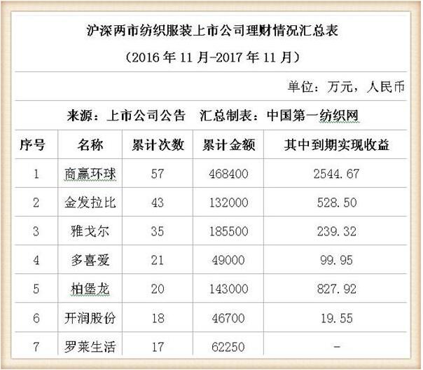 自2016年11月5日至2017年11月5日,沪深两市27家纺织服装上市公司累计理财次数达329次,累计理财金额216.97亿元,其间到期完成收益8911.59万元。