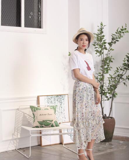 白色T恤+半身长裙,白色T恤热潮直到今年还不退,如果你不满足于普通的短袖T恤并且自信露出好身材,那么简约又时尚的绝对是你的明智之选!印花裙最能打造清新的小淑女范儿,搭配的白色T恤收进裙子腰头里,利落而清爽,T恤的印花既点缀了白色T恤的乏味,又呼应了印花裙的风情,起来一个承上启下的效果