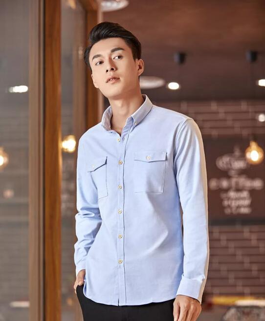 上身一件沉稳宁静的的浅蓝色系休闲衬衫,搭配上简洁的黑色休闲裤,休闲当中又不失传统的经典,让休闲风味尽显。