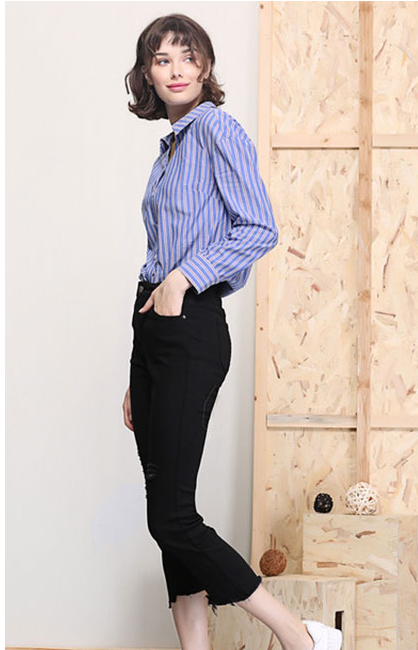 这一件蓝色条纹衬衫还有着复古的味道,搭配一条黑色紧身七分裤,一身显得十分轻盈又简约。