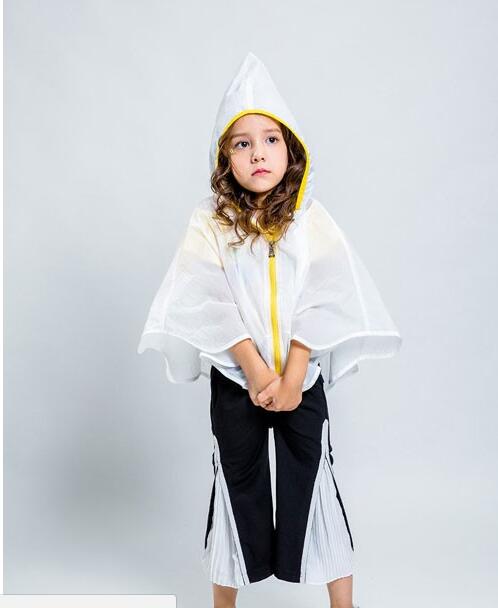简约而经典的黑白色对比,极富视角冲击力,别出新意的披风连帽式拉链外套,宽松舒适的款式既实用又美观,搭配一条黑白拼接的扩版休闲裤,小萌娃炫酷感超级拉风。