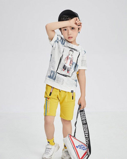 当满元素使孩子从小接触最早的文化教育,看着有趣的动画片,穿着镜头里的心仪的主角人物图案的白色印花T恤,搭配一条亮黄色的紧身五分裤,小朋友好像穿越到了动漫世界中。