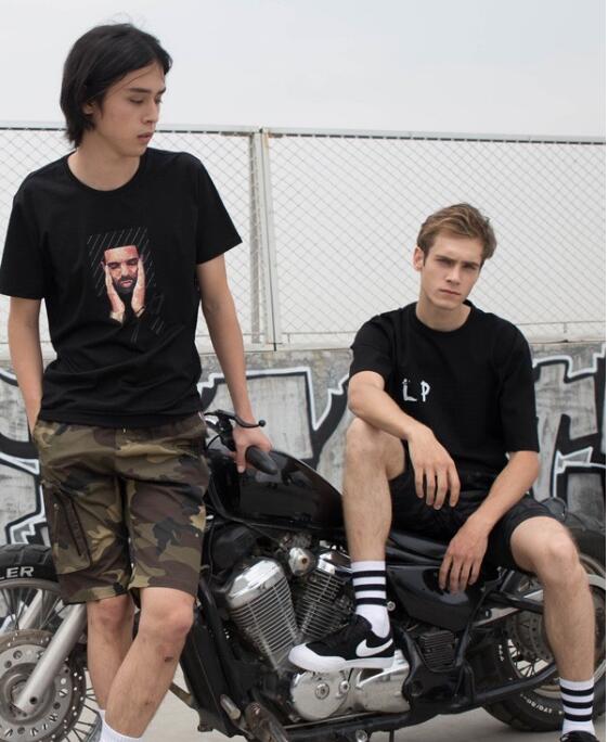 LOOK1:男生上身选择一件黑色的短袖,颜色经典百搭,实用性强,中间增添了个性图案的设计穿起来更具时尚感。下身搭配一条迷彩元素五分裤,迷彩元素个性时尚,增添了造型的时尚感。再搭配一双休闲鞋,打造出了时尚感的夏日造型!