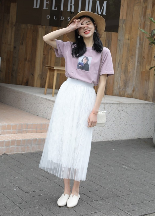 藕粉色T恤和欧根纱裙的结合,无疑是最仙的搭配了。浅浅的藕粉色,显白又衬气质。简单的印花,温柔又淑女的T恤,搭配双层欧根纱的裙子,气质非凡。一个度假风的帽子,百搭好看又防晒。耳边小巧的珍珠耳环,精致好看。脚上是一双白色切口小皮鞋,和轻柔的欧根纱裙,是今夏最气质的仙女搭配了。
