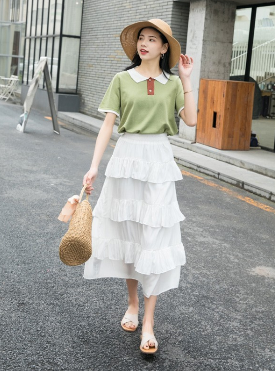 最火的显肤色的绿色和最具时尚特色的Polo的结合,是这套裙子的上衣搭配。浅绿色是很显肤色的颜色,近些年来,绿色可以说是时尚的代表了。绿色与永不过时的Polo衫相结合,与传统的Polo衫不同的是领口的设计,田园风的小圆领设计增加了俏皮感。裙子是蛋糕裙的款式,裙摆能够遮盖住的臀部,美化身体线条,活泼甜美。蓬松而甜美的蛋糕裙也适合年龄稍长的女性,可以起到减龄效果。脚上是一双皮质小凉拖,清凉有质感,