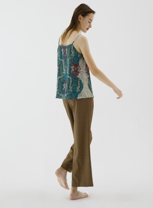 LOOK2:想要清凉一夏,女生可以为自己选择一件透气性好的单品。上身可以选择一件拼色印花吊带背心,印花元素个性时尚,吊带款式穿起来清凉透气、有女人味!下身可以搭配一条长裤,有质感,穿起来利落自然。