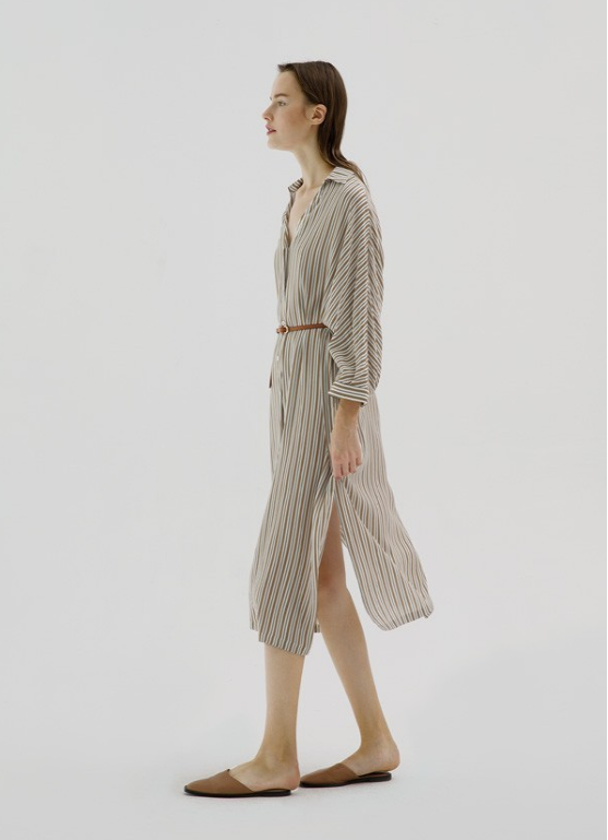 LOOK1:衬衫裙是今夏运用比较多的单品,女生可以为自己选择一条雪纺条纹衬衫裙,来打造随性自然的造型。奕色女装品牌的这款雪纺条纹衬衫裙,雪纺材质透气飘逸,条纹元素经典时尚,细腰带的设计,凸显腰线,展现出苗条的身型,穿起来随性自然。再搭配一双简约风的包头拖鞋,穿起来提升了造型的气质,打造出了随性自然的夏日造型!