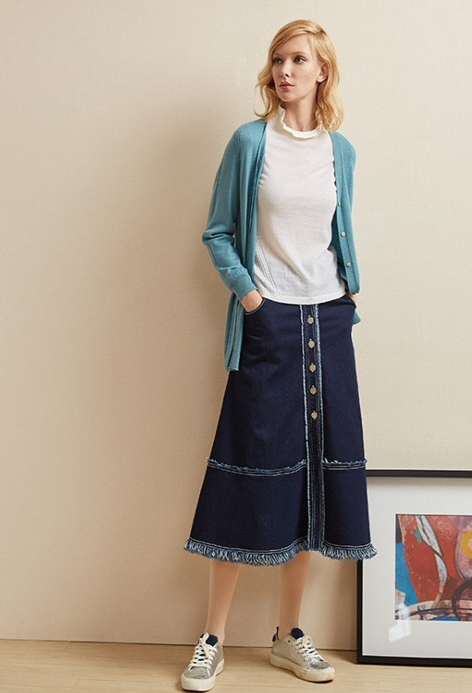 蓝色针织开衫搭配,蓝色的清新感加上牛仔面料的经典体现,半身裙的效果流苏的修饰,不仅拥有个性感,流苏的设计也充满时尚效果,上衣的白色清新自然,配上一件薄款针织开衫,秋季刚刚适合。