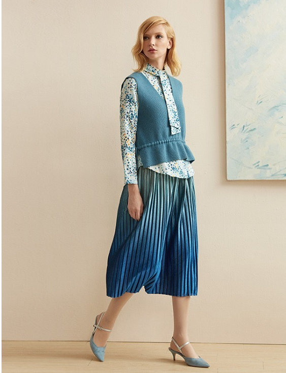 蓝色针织背心,在秋季穿背心的人很多,一款衬衫+一件针织背心或者毛衣背心效果就很不错,衬衫可以选择花色的设计,配上一件蓝色背心精致十足,下身一条蓝色渐变色百褶半身裙,拥有个性的体现。
