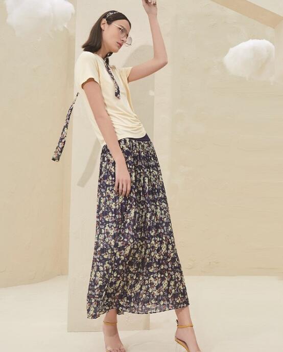 这款碎花半身裙花色和上一条相搭配,其实是可以组闺蜜装的两条裙子。半身裙采用百褶造型更,淑女又百搭。半身裙与明黄色T恤搭配真的是最简单了,黄色显白又温柔,这样的搭配休闲又方便,这样的简约美清新靓丽,很柔美非常有夏天的感觉!