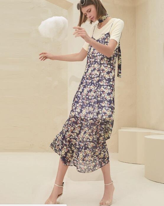 吊带裙是夏天必备的一款裙子了,将碎花元素与吊带裙相结合很奇妙,完全不会有显老气的问题。花色是深蓝色与鹅黄相结合很温柔耐看,里面搭配一件鹅黄色T恤与裙子更好的融合,颜色很显白温柔。搭配了一条碎花元素的系带非常高级好看。搭配一双细带高跟凉鞋适合逛街,如果搭配小白鞋真的很适合出游的时候穿哦,很田园温柔的感觉。
