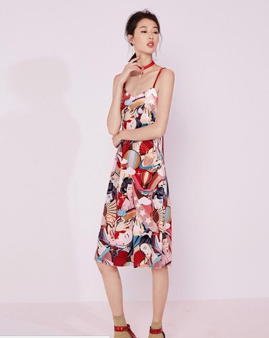 碎花吊带裙很常见,这款吊带裙你肯定没有见过吧!这么繁杂的印花,复古的头像印花,抹胸的设计,红色的肩带,小性感中带着俏皮可爱。这件吊带裙真的非常显肩颈修长,很适合在座的各位小仙女们!