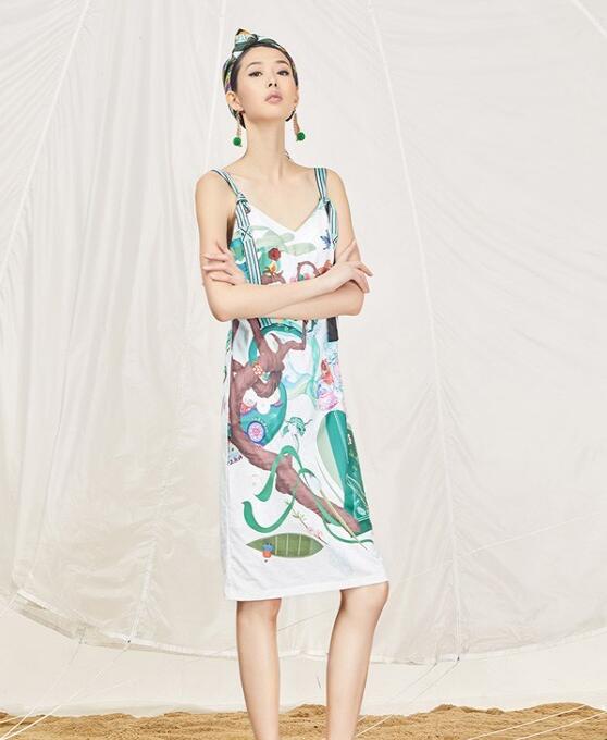 夏天是一定要拥有一件吊带裙的,这个一眼看上去就会被吸引的花色,独家设计的似插画一样的图案,真的非常独具特色。小V领更突显锁骨,加上微微有些收腰的设计,真的会非常显瘦。主体颜色看上去是绿色,也会在夏季显得非常清凉舒爽。