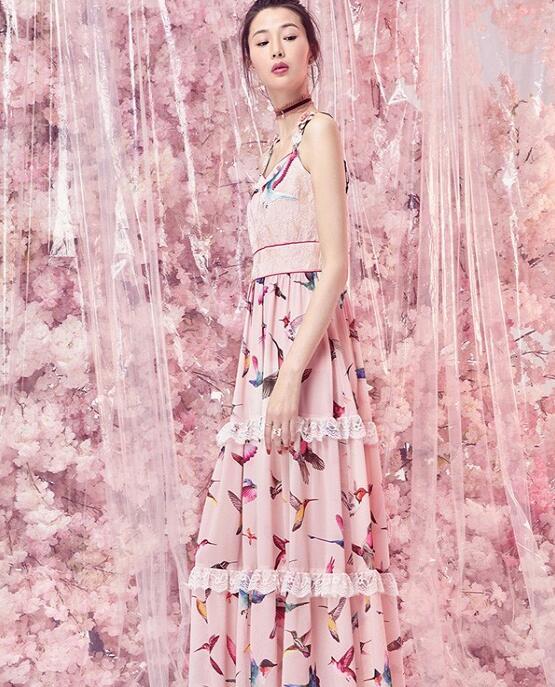 淡粉色的底色,印花是白鸟群集,非常的时尚有特点。仿佛是从傍晚的晚霞边走过来的百鸟之神。伞字裙摆,有些微微的蛋糕裙边,加上蕾丝的设计,非常有公主范儿。带着甜美少女的气息。