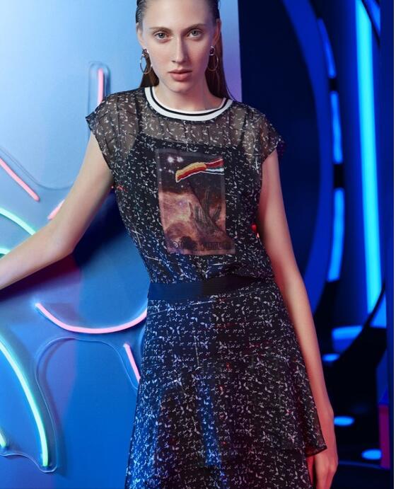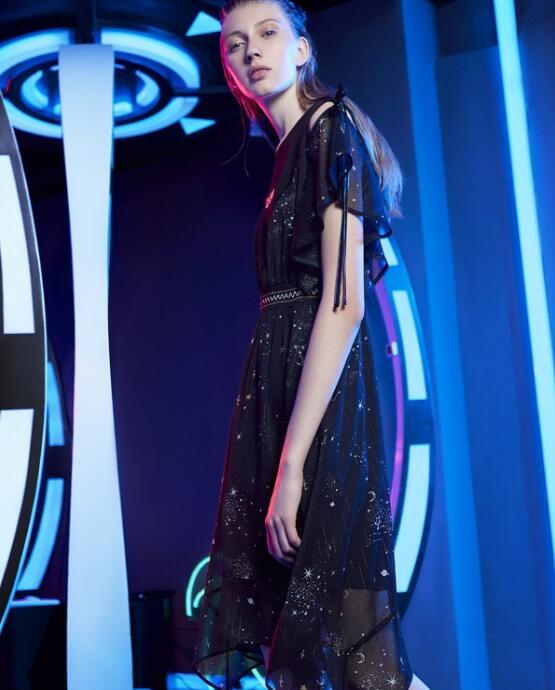 这款黑色雪纺裙是比较少女风的,裙身上的星空元素运用的很巧妙。袖口的不规则花边显手臂纤细。裙摆是不对称的,给人视觉时尚的冲击略显俏皮可爱。这款裙子对微胖的女孩子非常友好,很显瘦又活力满满的一款裙子。