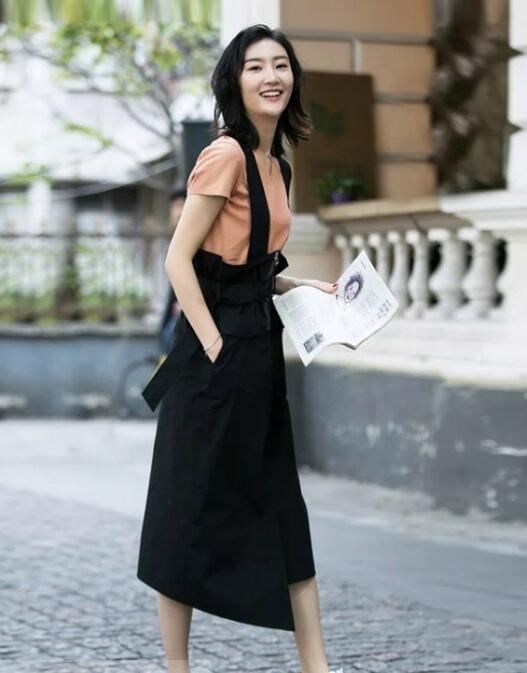 背带裙也是很休闲的一款,在夏日也很受欢迎。搭配一件纯色T恤,这样的穿搭简洁有休闲,黑色的背带裙看起来很显瘦,宽松的版型很适合各种身材的妹子,不规则的裙摆,优美小腿的线条,搭配一双小白鞋,这样的穿搭休闲又时尚