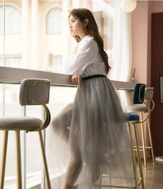 衬衣搭配半身裙,这样的休闲穿搭也很受欢迎。白色本身就是很纯洁的一种颜色,白色生意的更显气质,下身搭配一条胡思而网纱半身裙,很仙的一款裙子,更好的遮住腿部多余的肉肉,网纱打造朦胧感,性感有神秘。灰色和白色的搭配,怎么搭怎么还看,不管是如何穿都不会出错。搭配一双高跟鞋,优雅又大方。