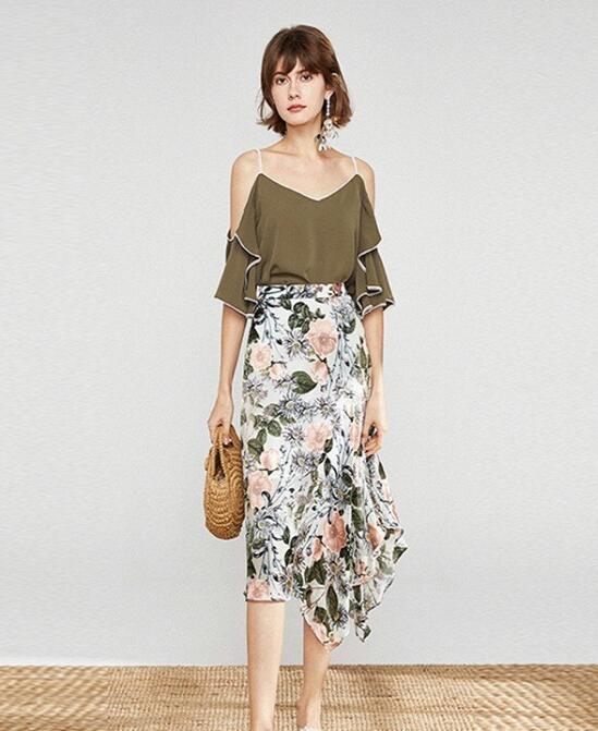这套搭配走的就是一个甜美优雅的风格,上衣是一字肩的设计,在肩部加了细细的吊带,这样的设计不会显得太过暴露,还方便行动,袖子是荷叶边的设计,甜美又不失优雅,简单的v字领也可以很好的修饰脸型,草木灰色是比较不常见的颜色,非常有特点。下面的半身裙是高腰的设计,显得腰部很纤细,裙子上的印花是花朵和叶子,叶子的颜色和上衣的颜色是一样的,这样的搭配非常的和谐自然。
