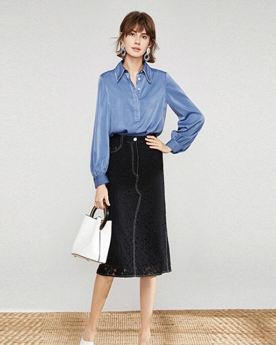 本身裙不仅是甜美系女生喜欢的时尚单品,还有很多成熟优雅的女性也很爱穿。这套搭配就很适合身在职场中的职场女性,一整套的搭配是知性干练的。上衣是蓝色的衬衣,简单的设计看起来很显质感,v字领是很显气质的,下面搭配的是一条黑色的半身裙,高腰的设计和衬衣搭配起来很有气质。黑色的裙子很大气,这套衣服穿起来就是满满的气场,隔着十米都能感觉得到强大的气场。