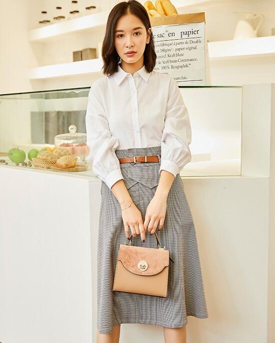 作为秋季最经典耐看的时尚单品,衬衣的搭配怎么能少得了呢?这一整套的搭配真的非常的完美出色,上衣是一件最经典耐看的纯白的衬衣,很简约的设计让人忍不住想尝试,下面搭配的也是很简单又很有设计感的半身裙,非常的耐看,腰部还有一根皮质的腰带,真的很有质感。