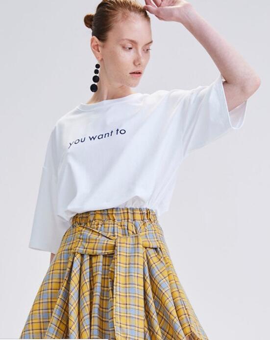 短袖是实用性强,百搭的一款的单品。女生可以为自己挑选一款白色的短袖,穿起来清爽干净,增添了英文图案让造型更具时尚感。下身搭配一条黄色格纹半身裙,颜色出挑,格纹元素经典时尚,不规则裙摆设计,让造型更具时尚感,呈现出青春有活力的造型!