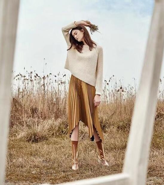 半身裙是职场女性的心头爱,简单易于搭配,不同的上衣能穿出不一样的风格。这款半身裙颜色上采用高级大气的香槟金,温柔气质的金色很好的凸显了整体的气质。这款半身裙百褶的设计时尚又减龄,裙摆的不规则设计增加了几分轻盈灵动感,完美的垂顺度更显这款半身裙的质感。搭配一款简单的杏色毛衣,圆领的设计能够很好的展示柔美的颈部线条,这样一款简单气质的搭配,不管是上班还是逛街都会非常合适哦!