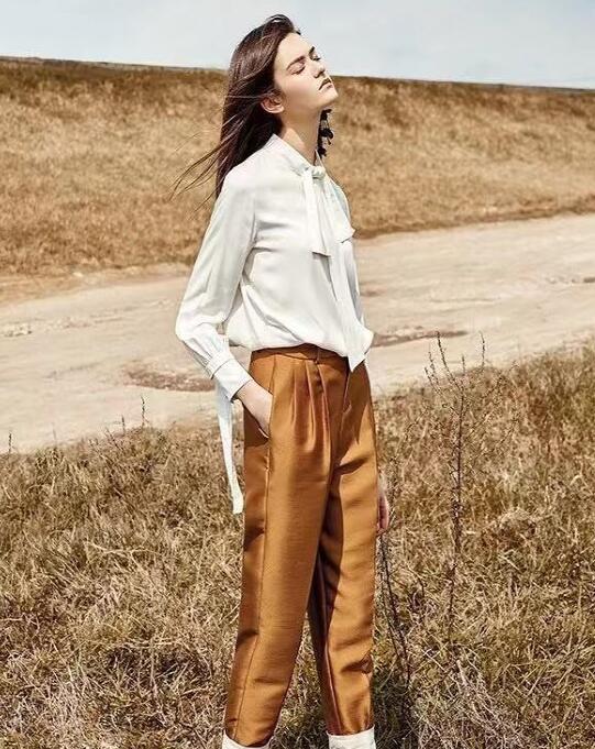 衬衫是每个女生的必备单品,这款白色衬衫清新时尚,简单甜美的领结设计增加了几分时尚感。利落精细的剪裁以及完美的垂顺度使这款半身裙更有质感。袖口的收紧设计也非常细心。下身搭配一款高级大气的香槟金裤子更是提升了整体的气质感。这款裤子的版型比较宽松,能够很好的修饰腿型。高腰的设计能够很好的纤细腰身,轻松穿出好身材!