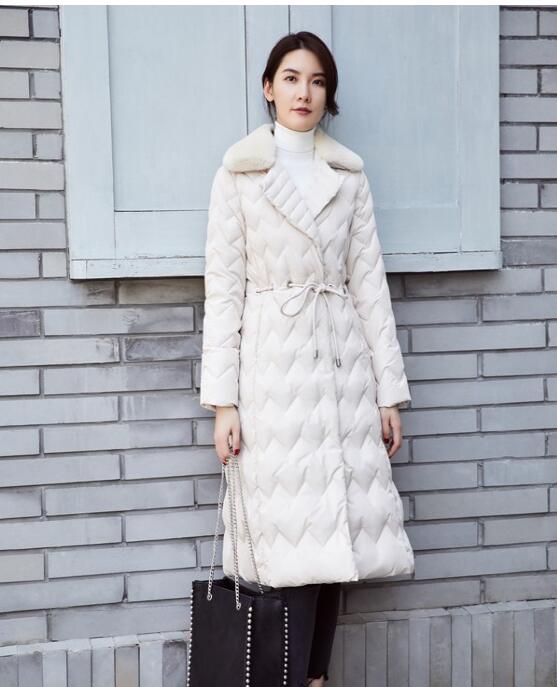 这款米白色的羽绒服版型看起来是不是很修身而且最重要的就是它真的很保暖,设计剪裁也很时尚,带帽的衣领看起来很是高级,内搭一件修身的白色高领毛衣,腰间搭配一条腰带系出蝴蝶结彰显出女性的浪漫与甜美,中长款的款式很是好看,下身搭配一件黑色修身的裤子,让自己看起来不是很臃肿难看。