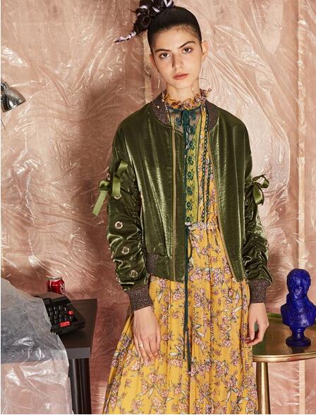 绿色的外套也不能放弃哦,这款复古绿穿在身上是不是很好看,也很复古时髦,小款的版型很适合小个子女生穿哦,内搭一件碎花连衣裙,衣领处花边的设计彰显出女性的优雅与浪漫,腰间收腰的设计轻松将小蛮腰展现出来,碎花与黄色的搭配在清新自然,搭配一双高跟鞋,整体的造型很是大方显气质。