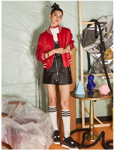 这款半身裙的搭配是不是很好看,红色外套穿身上很是显肤色,也很显气质,棒球服的设计很是好看哦,内搭一件白色上衣,圆领的设计修饰脖颈曲线的时候也将脸型修饰的很好看,黑色皮裙的搭配很是好看,裙摆的长度露出性感的腿部曲线,搭配一双平底鞋,整体的造型很是简约优雅。