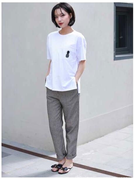 相比较于黑色的沉稳大方,白色看起来更清爽,看这一系列的搭配:上身着一件白色的T恤,洁净的衣身,在左胸前有一个菠萝的刺绣图案,精致、小巧,增加了一丝趣味性,看起来不再单调,下身搭配一条休闲裤,休闲舒适不缺时尚感。