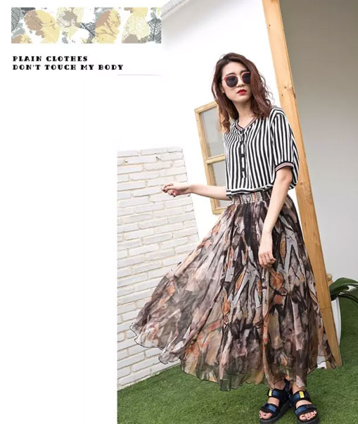 长款百褶裙与淑女、文静好像密不可分,但与不规则多彩图画偶遇后是不是立刻英俊特性起来了,再调配条纹T让你英俊之余不失该有的女性之柔。