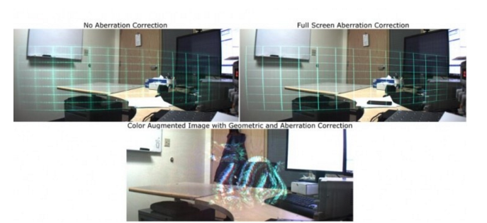 鄙人图中,微软展现了离轴光学构造下的视图。在左上图中,全息图并未通过像差纠正,散光景象十分严重,一起还伴随着桶形畸变的出现。右上图则用上了像差纠正,图上的线条从头明晰了起来。下图则是像差纠正作用下高画质的杂乱全息印象。