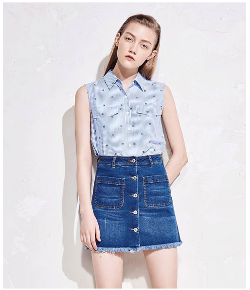 本波段旨在营建一个清新的都市空气,用洁净布料,爽性线条描绘出一个干练妥当的现代女人形象。布料上精选吸湿透气、舒适凉快的色织条纹、色织提花、乱麻、雪纺、天丝等,配以白色、蓝白条纹、牛仔蓝等清新色彩,在触觉和视觉上给人两层凉意。一起加入了盛行元素:一字领、荷叶边、木耳边、布料压褶、内衣外穿……