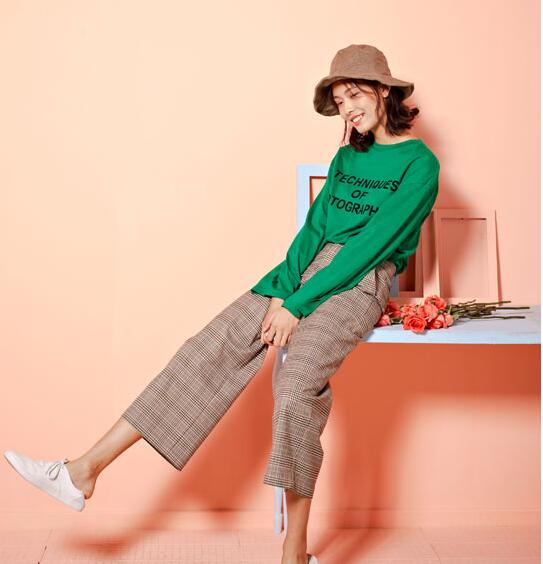 或许你也可以穿一身oversize,做一个文艺安静的美少女。上身一件绿色宽松的卫衣,衣间简单的黑色英文点缀,简约时尚,美观耐看不落俗。搭配一条黄褐色格纹的九分阔腿裤,戴一顶棕色礼帽,十分适合到海边去漫步,在旅行的古色古香中畅游。