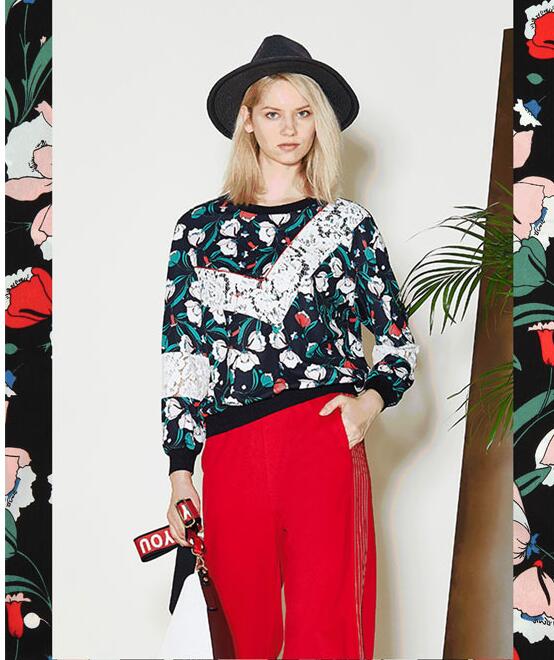 大面积花卉的运用让上身的卫衣,充满春天独有的百花齐放般魅力,袖子蕾丝拼接为酷帅的卫衣增加了一丝丝小女人味,火红的阔腿裤,让你在春天绽放出犹如夏花般灿烂的魅力,无论出行还是聚会,你都能轻易俘获众人关注的目光。