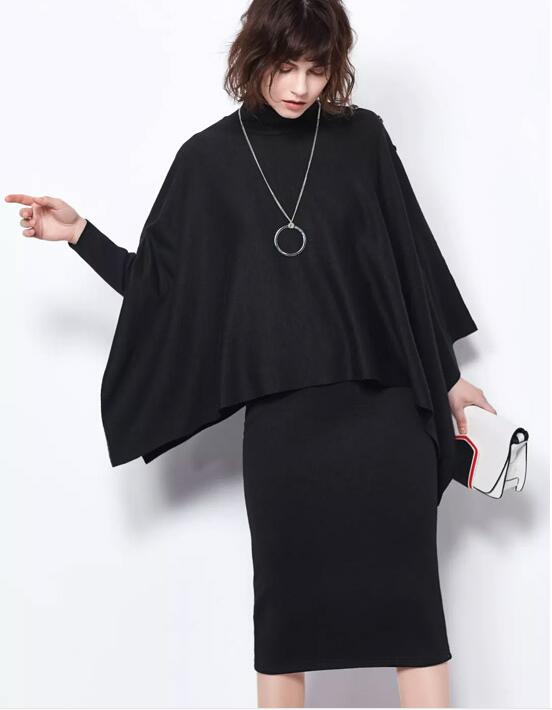 黑色斗篷搭配同色系包臀裙,堆砌式高领使得整个造型不会单调无味,黑色系散发出高贵的气质,包臀裙呈现的曲线又使整体不乏女人味。‍