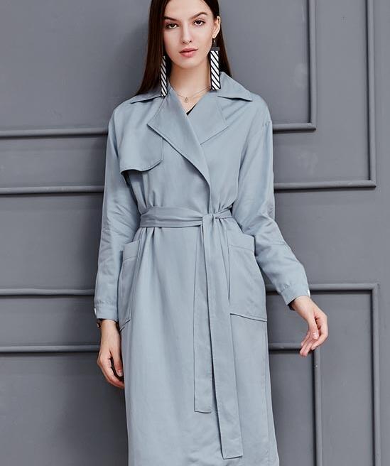 优雅的淡蓝色,如秋意正浓的晴空,不带一丝纷杂,简约干练而不拖沓。长长的衣身,优雅的垂坠感。精致的衣领棱角分明,彰显奕奕神采,轻柔的腰带用以提腰,显高显瘦,轻盈飘逸。