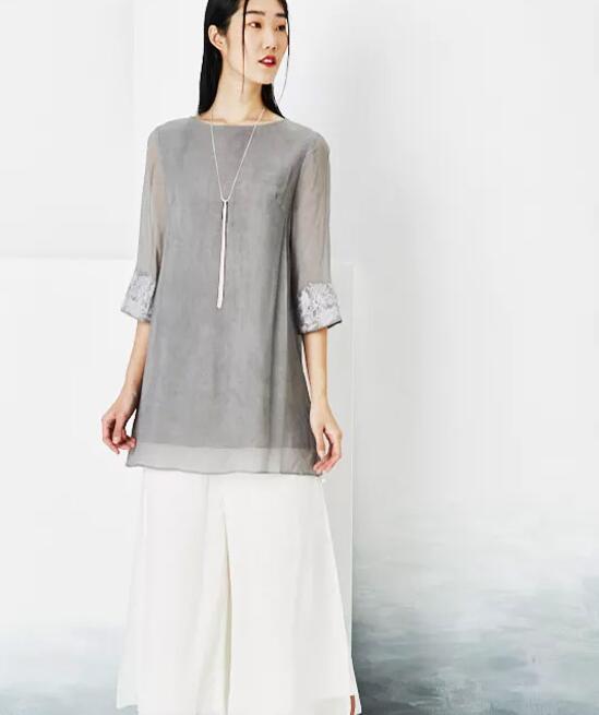 真丝绣花上衣,温婉而秀气。小A摆廓形,简单大方。花卉纹样绣花,精致有质感。