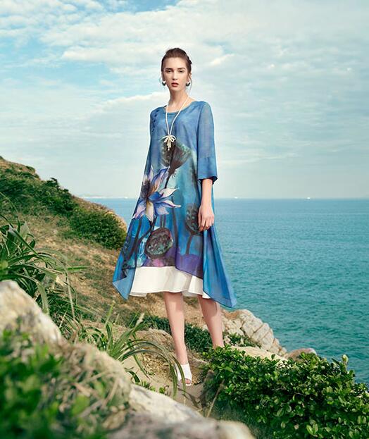 名族风还是人们的灵感与信仰,心中所崇拜的都在此碰撞,繁复与极简之间,是秀蓓儿女装的最佳魅力展现!一款湖蓝色连衣裙,海边为背景,结合裙子上的莲花,就像是天生生长在这个地方,十分吻合!