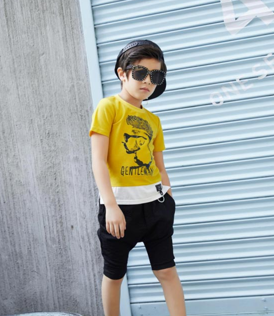 童装的配色没有固定的格式,过分的程式化会显得呆板,但变化太多又会显得杂乱。最简单的宗旨就是配色协调,让孩子穿起来以后显得活泼、可爱、帅气。黄色与白色相互拼接的T恤,与众不同的版型,搭配“叽叽哇哇“黑色短裤,穿在小男孩身上十分清爽帅气。