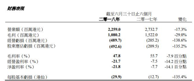 上半年,集团运营亏本4.897亿港元,上年同期运营亏本2.052亿港元;毛利同比下滑29.0%;集团毛利由15.220亿港元减至10.802亿港元,毛利率狂跌770个基点至47.8%。