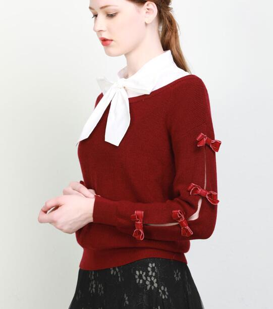 经典暗红色针织衫,面料上选取舒服又亲肤的弹力针织,衣袖处个性蝴蝶结设计,甜美又优雅,略宽松的版型和插肩袖,尽显独特气质,凸显小女人的温婉知性魅力。白色衬衫也是很吸睛的单品哦~