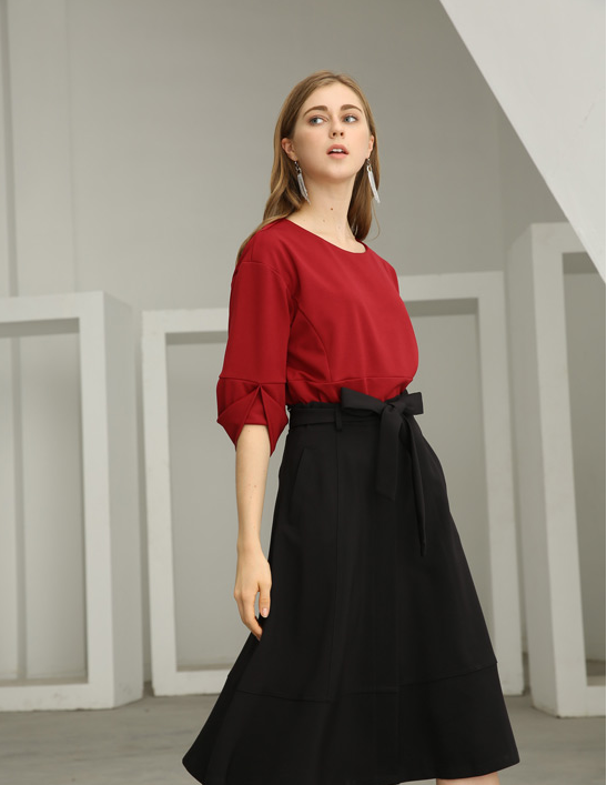 这条黑色半身裙的吸睛亮点在于材质的垂坠感,虽然带着点蓬蓬的弧度,但是却又运用了柔软的面料,将女性婀娜多姿的身材完美展现,行走间裙摆飘飘,满足你所有美好的想象。上身搭配的铁锈红衬衫也极具设计感,袖口的不规则几何形式裁剪,修饰手部线条,让手臂更显纤细。