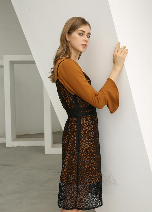深驼色针织裙搭配黑色带带,裙子和裙子的搭配,时尚度自然不用多说。深驼色针织裙修身立体的剪裁,在勾勒女性曼妙身姿的同时,又不失优雅气质。黑色吊带裙不规则的破洞设计,精致又具有趣味性,让女性穿上有一种若隐若现的诱惑之美。
