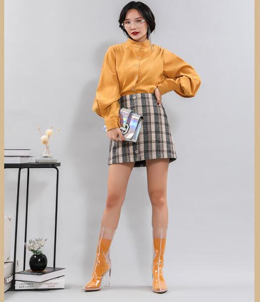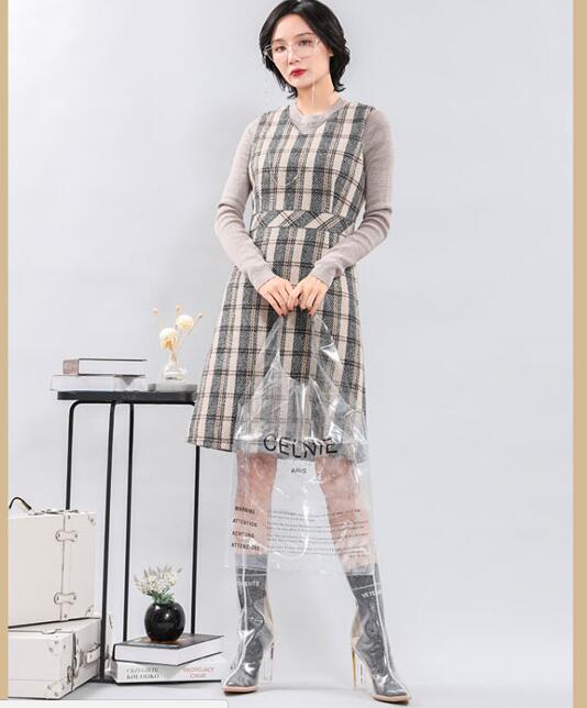格纹元素总是自然而然地和复古相提及。仿佛只要身穿一件带格纹元素的单品,就能沾染上那么一丝复古、霸气侧漏的气息。每个人都有与自己气息相契合的风格,除却气场强大的时髦精,复古格纹裙也能打造出安静怡人的温柔装扮。浅黑灰色系的无袖格纹裙,内搭同色系的薄款毛衣,脚蹬一双透明塑料高跟鞋,俨然出外景的时尚博主,时尚度直线上升。