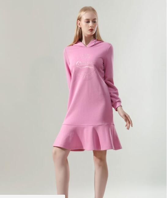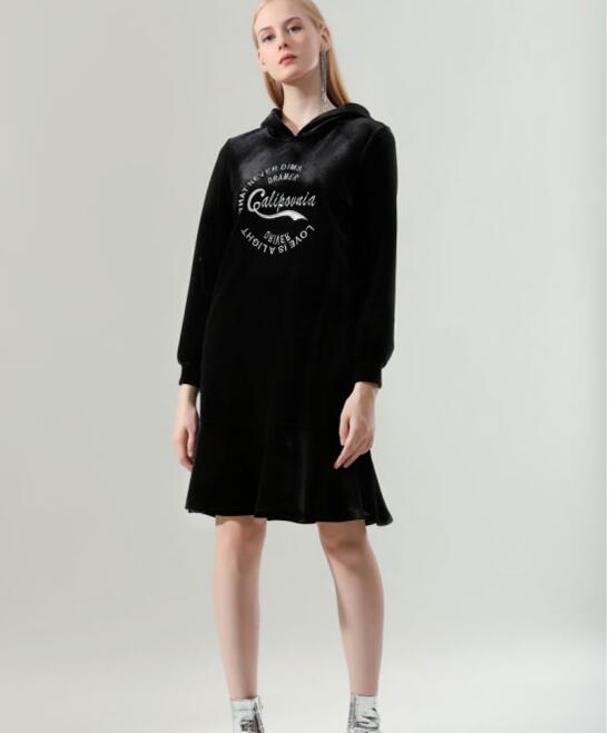 丹比奴时髦女装新款丝绒卫衣裙,版型休闲宽松,合适各种身材的女生,裙摆选用荷叶边规划,俏皮可爱,这样的裙装调配一双运动鞋或是一双短靴都非常美观。