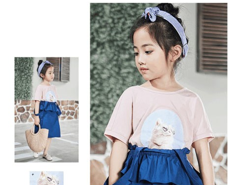 浅色彩的粉色T恤,胸前有猫咪头像胶印,