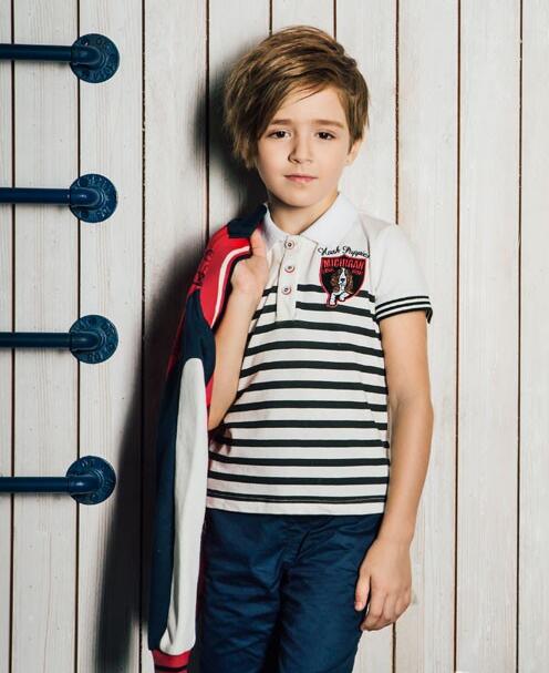 小男生这身穿搭传统与时尚的结合中,品质和舒适度是第一位,校服款式的制式外套,采用红、深蓝、白色拼接,体现儿童特色,白色与黑色拼接的条纹棒球衫,搭配一条靛蓝色五分休闲裤,质感与舒适兼具。